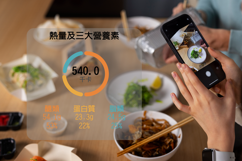 即時估算總熱量 (Calories) 以及關鍵的三大營養素(蛋白質、脂肪、碳水化合物)。